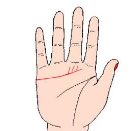 情况:感情线向上延伸的末端分出象晾衣竿或小树枝一样的小短叉,而且两叉长度比较对称,尤其该叉对应于中指和无名指之间的位置。